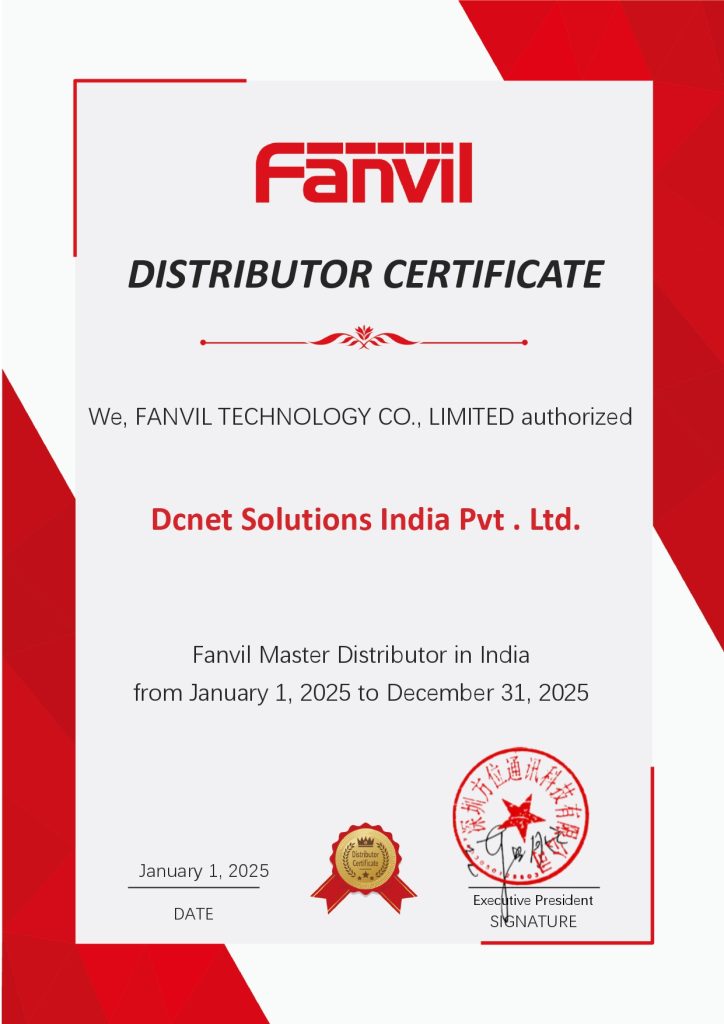 DCNet India proudly holds the Official Fanvil Distributor Certification, recognizing us as the Exclusive Master Distributor for Fanvil in India since 2012. This certification reinforces our commitment to delivering 100% genuine Fanvil products, competitive pricing, and trusted after-sales support across the nation.