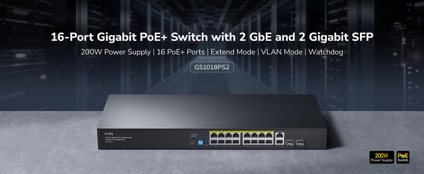 A rack-mounted 18-GbE, 2-SFP PoE switch with a 200W power supply and a silent cooling system, featuring Extend/VLAN modes, and Watchdog feature.