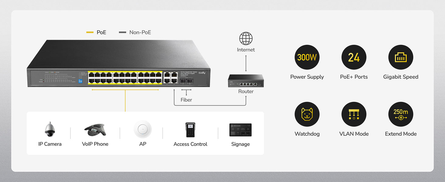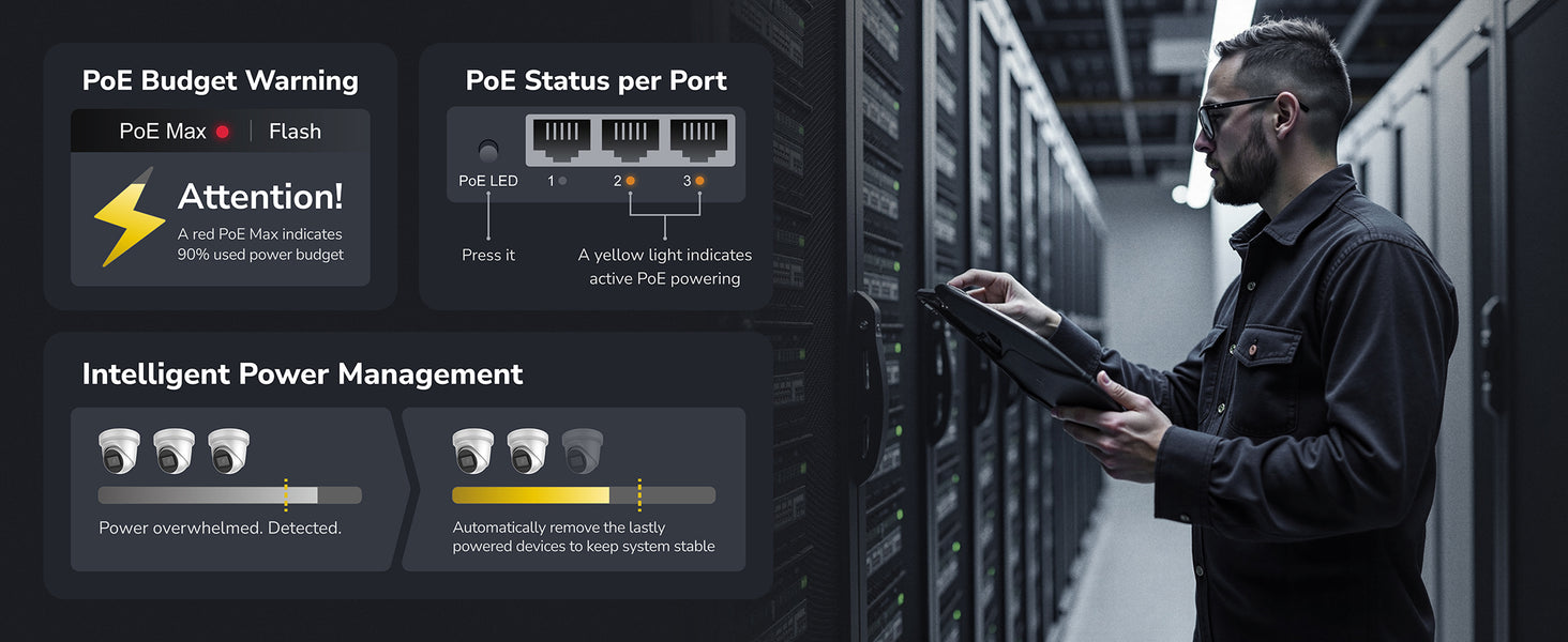 Each PoE port delivers up to 30W of power, making it suitable for access points, IP cameras, digital signage, and most other PoE devices.