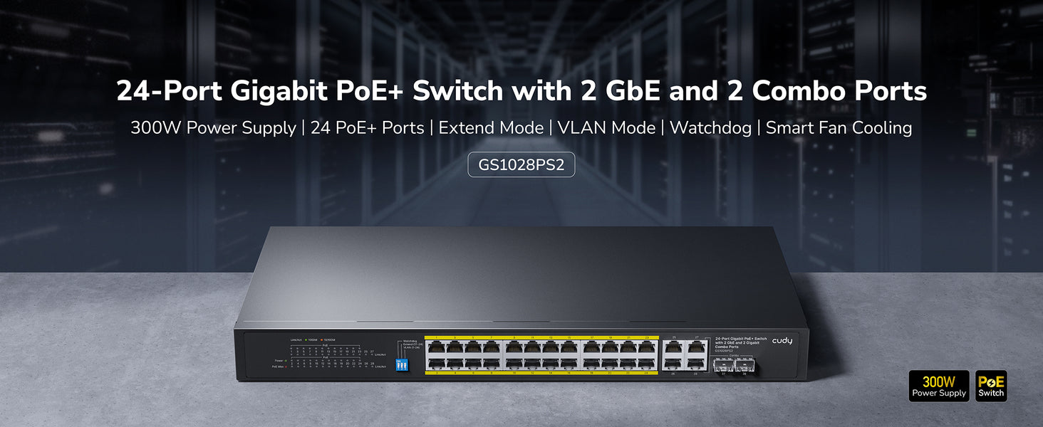 A rack-mounted PoE switch with a 300W power supply, featuring 24 PoE GbE, 2 uplink GbE, and 2 uplink GbE/SFP combo ports.