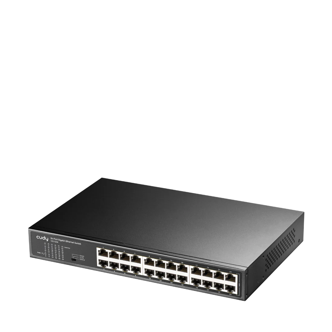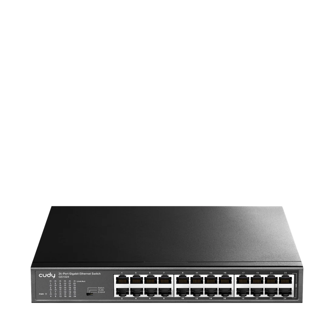 A 24-GbE switch with VLAN/Extend functions and a fanless cooling system.