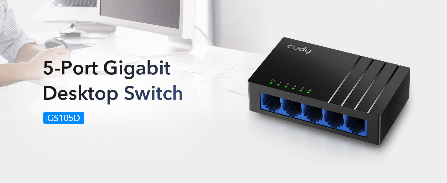 A 5-GbE switch with a modern design, supporting full Gigabit speeds on all five ports over distances up to 140 m, and featuring a super-efficient chipset with idle power consumption of just 0.2 W.
