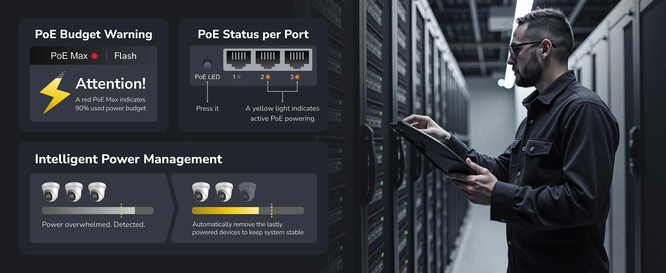 A Gigabit PoE switch with a 120W power supply and a silent cooling system.