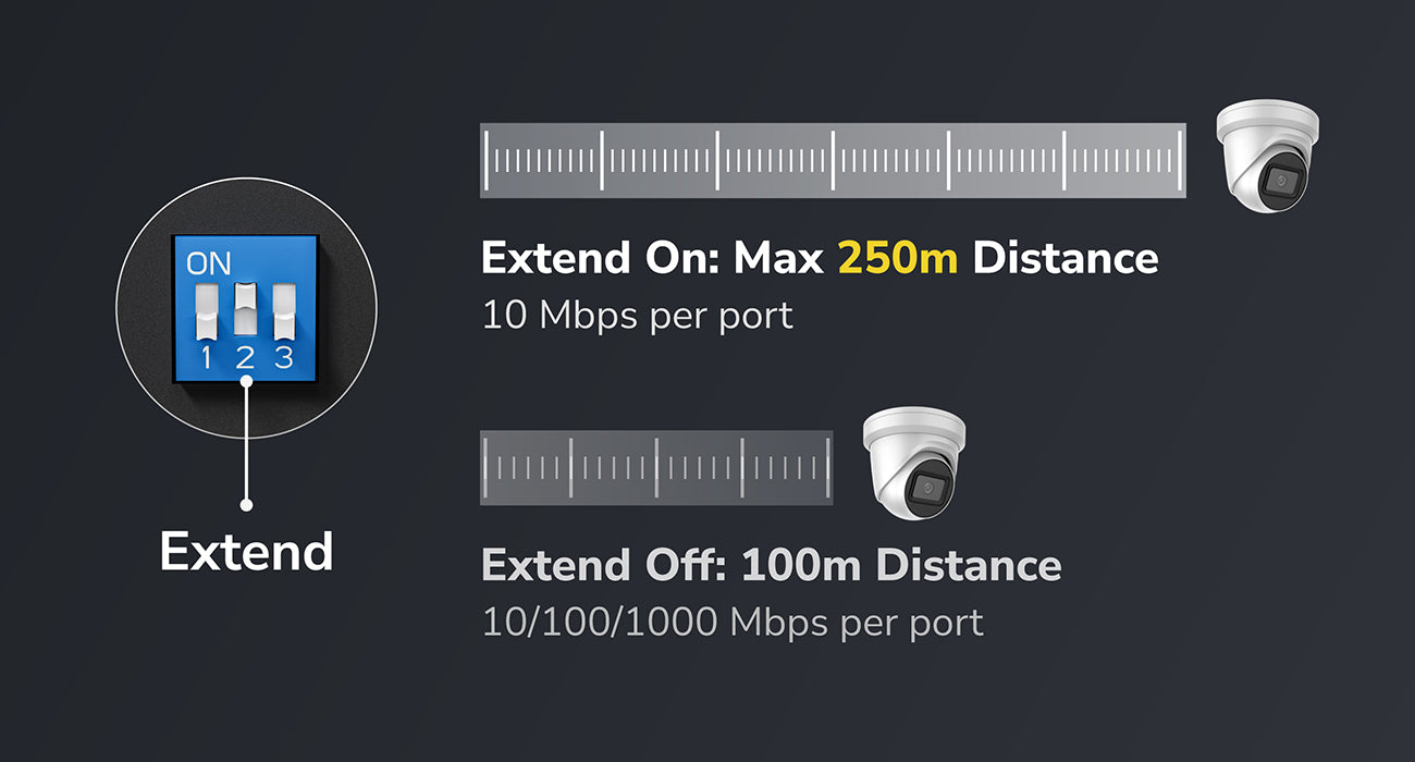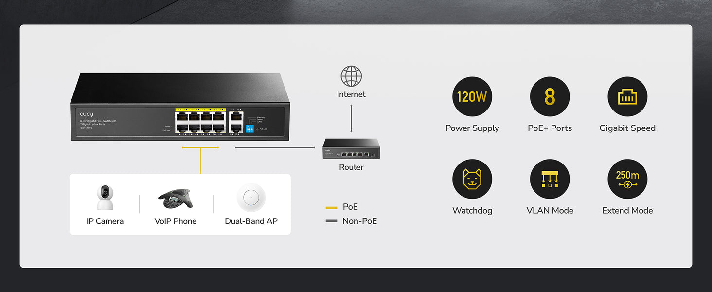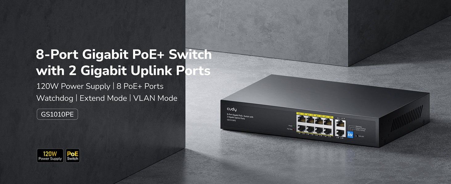 A PoE+ switch with a 120 power supply and a silent cooling system, featuring independant control switch for Extend, VLAN, Watchdog feature.