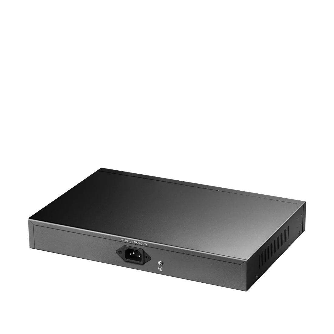 A rack-mounted 26-GbE, 2-SFP PoE switch with a 300W power supply and a active fan cooling system.